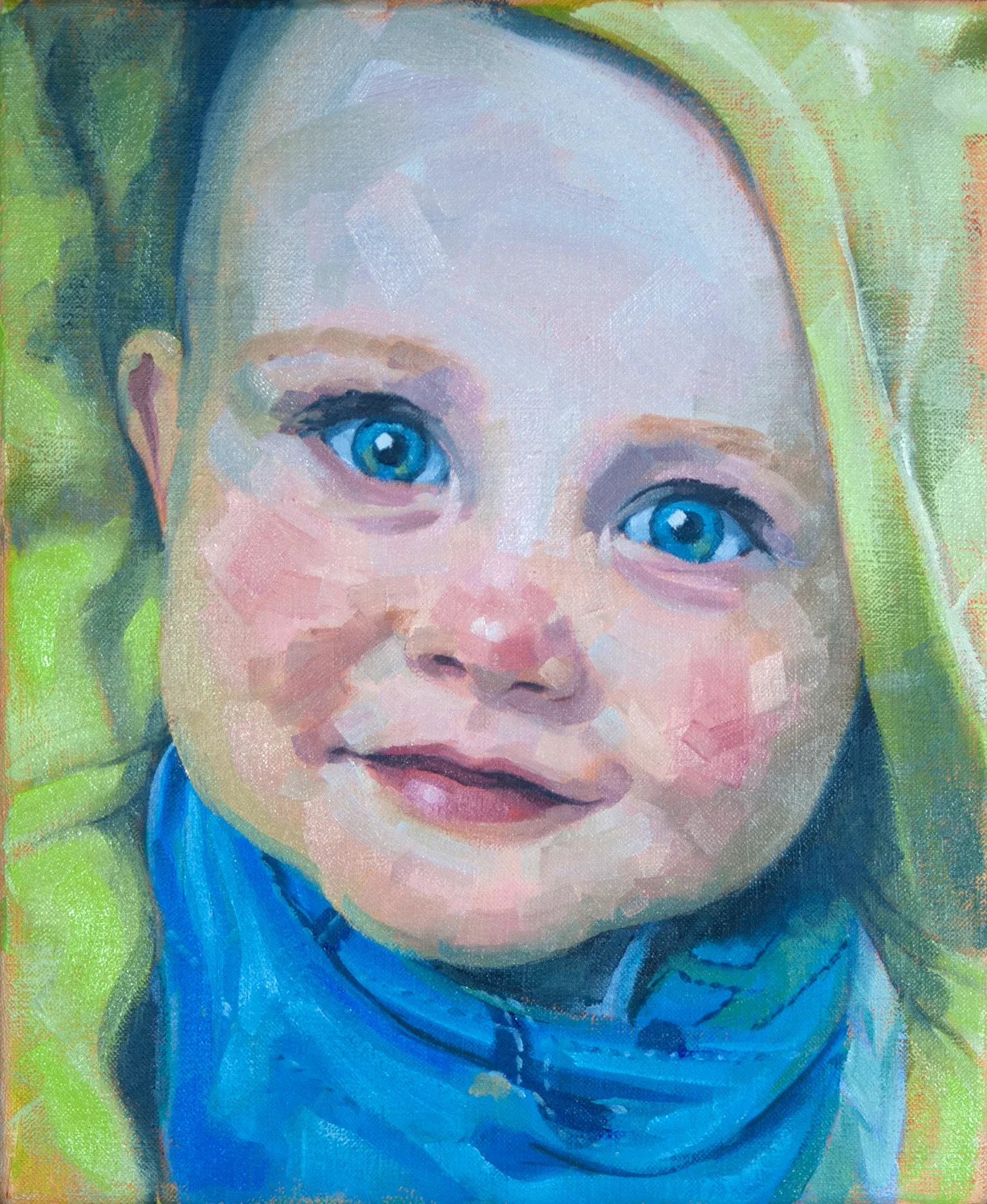A painting of my son aged 9-months. My favourite painting to date and one that will always have a special place in my heart. At that age he would instantly strike a pose whenever a camera or phone was in front of him. This painting captures his infectious smile and energy for pure fun.