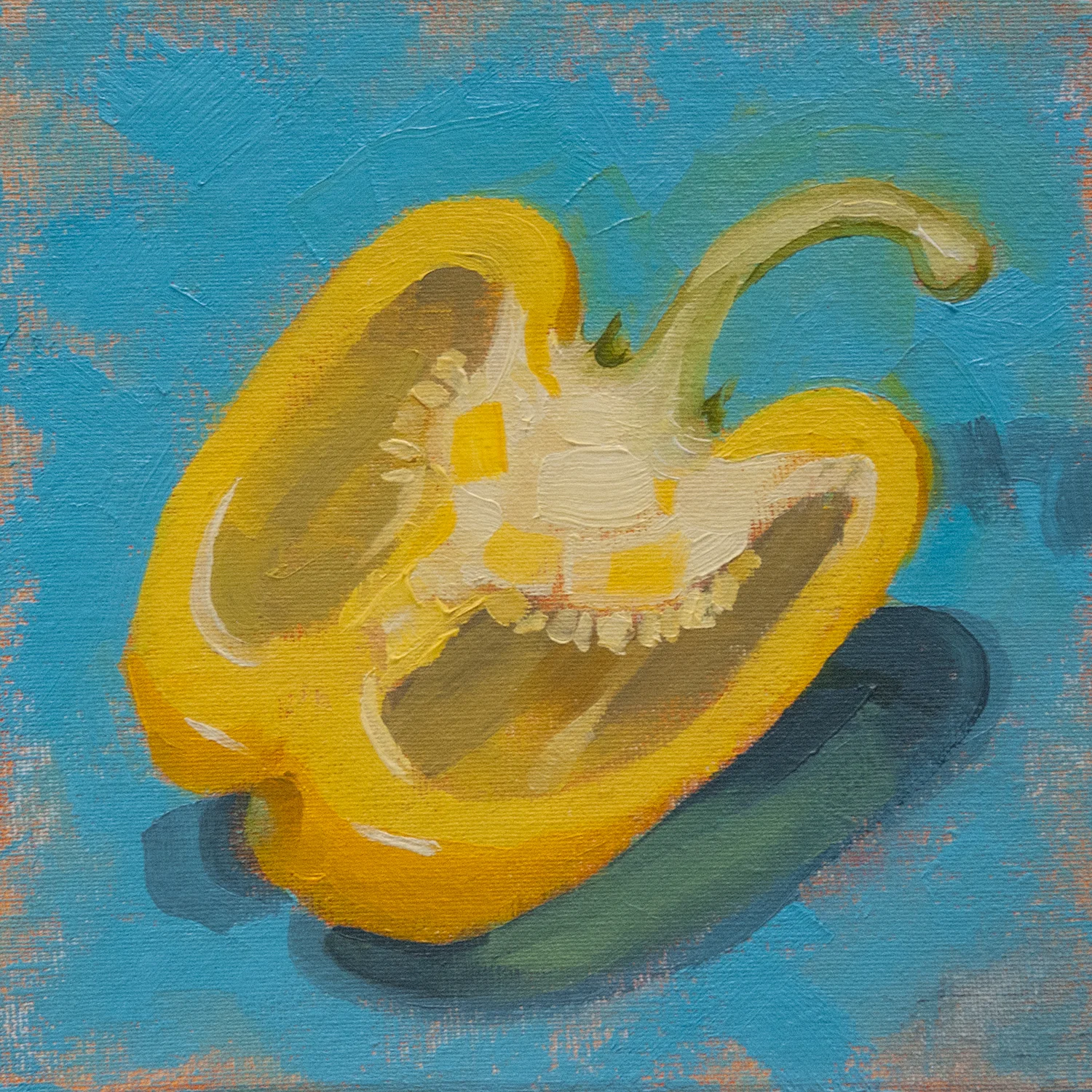 I love painting peppers, I could paint them till the cows come home. With this one I wanted to literally get inside the pepper and paint its hidden side. The bit we normally throw away.